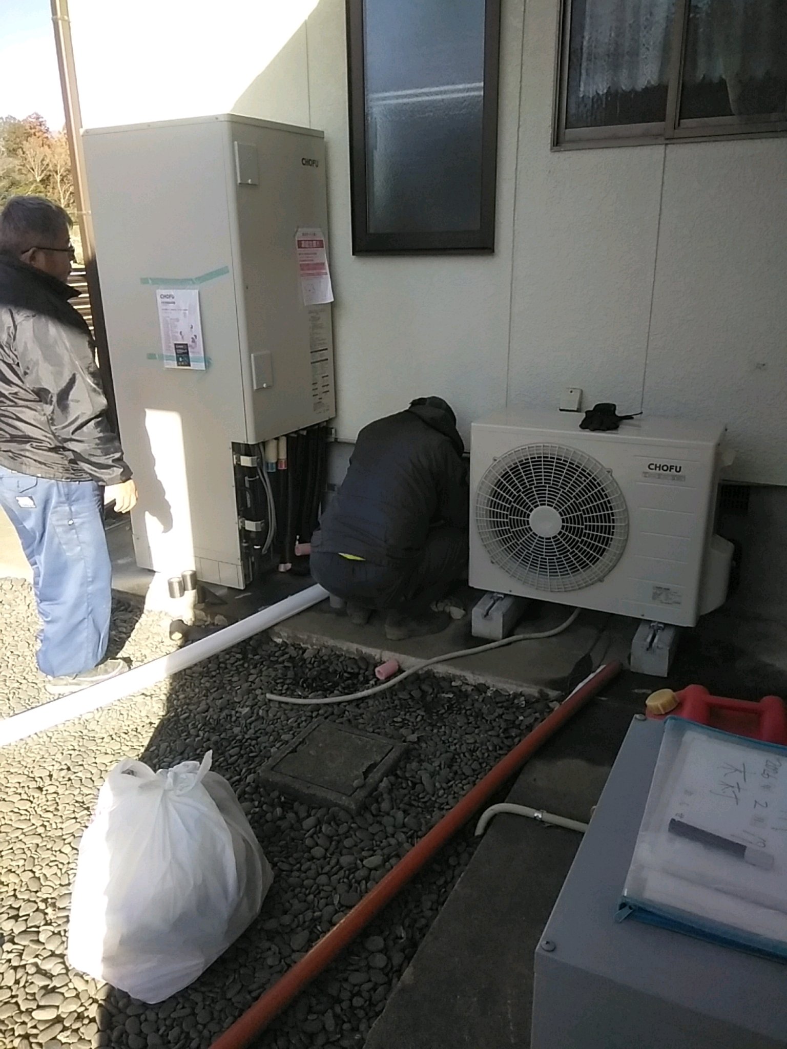 本日は気温も上がる2月8日です。なんとなく 筑波の里にも春近ずく雰囲気です。今回の作業はつくば市の東光台でのエコキュート交換作業です。エコキュートの制御部品 三方弁を一旦修理交換して その後14年ほど お使いでしたので ヒートポンプ 本体タンク 交換いたしました。