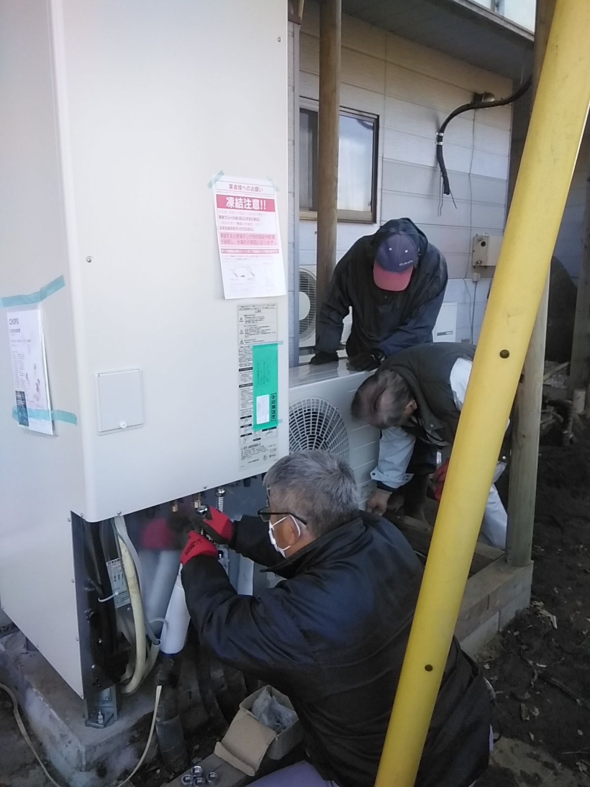 数日前にエコキュートが 稼働しなくなり プロパンガスの給湯器を仮設して お湯を確保しました。お客様の不便を 快適にするのが 私どもの仕事だと とらえてビジネスにあたっております。